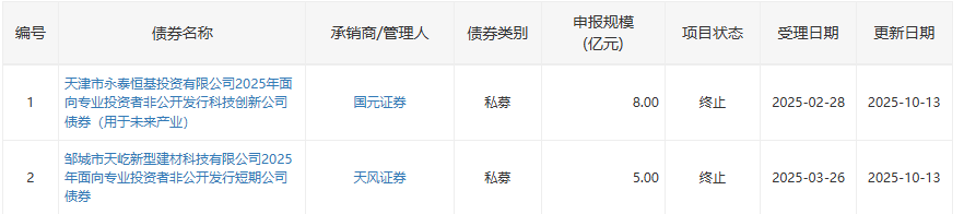 其中,“天津市永泰恒基投资有限公司2025年面向专业投资者非公开发行科技创新公司债券(用于未来产业)”项目状态更新为终止。该债券拟发行规模8亿元,承销商/管理人为国元证券,受理日期为2025年2月28日。