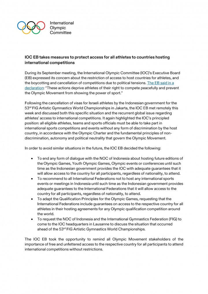 1.终止与印度尼西亚奥委会关于未来举办奥运会、青奥会、奥运赛事或会议的任何对话,直到印度尼西亚政府向国际奥委会提供充分保证,允许所有参与者无论国籍如何,都能进入该国。